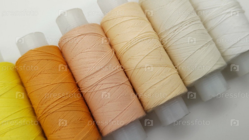 Разноцветные швейные нитки. Катушки швейных ниток разных цветов для профессионального портного, швеи и рукоделия. Белые, бежевые, желтые и оранжевые нити, пастельные тона. Крупный план
