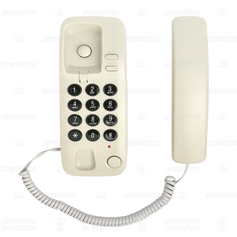 Маленький домашний стационарный телефон с русским алфавитом на кнопках, изолированный на белом фоне
