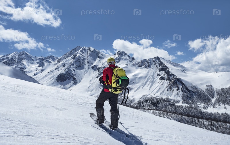Активный мужчина с рюкзаком катается на лыжах на фоне гор