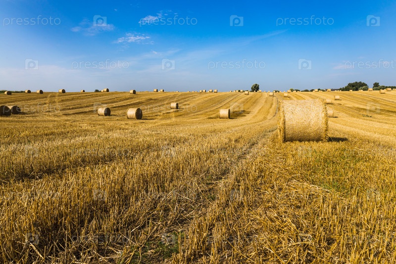 Поле сельского хозяйства после сбора урожая с большими тюками сена на пшеничном поле