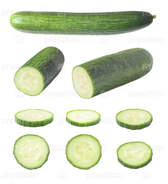Набор цельных и нарезанных ломтиками гладкого огурца на белом фоне