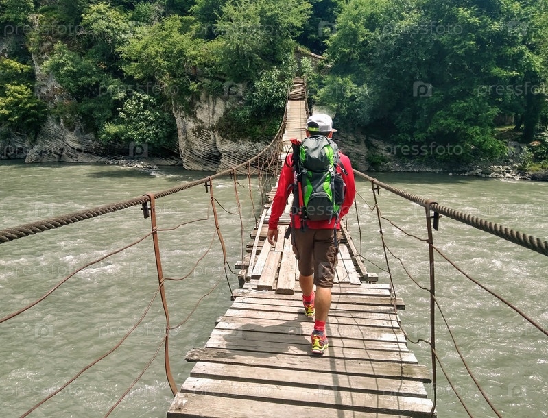 Молодой активный человек с рюкзаком ходит по подвесному деревянному мосту