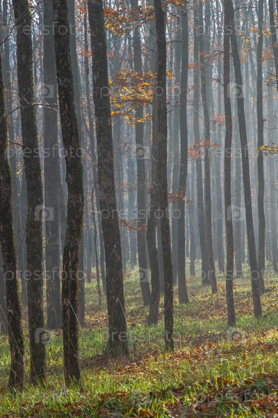 Многие стволы деревьев окутаны легким туманом