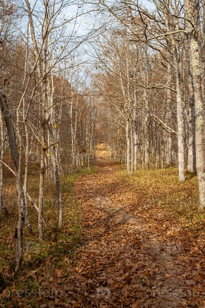 Усыпанная листьями дорога тянется в гору среди голых стволов деревьев