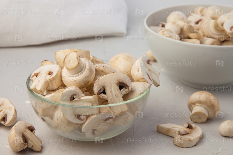 Свежие нарезанные грибы в круглых мисках. Крупный план