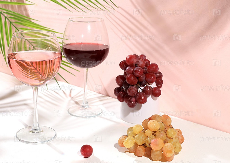 Современный натюрморт с белым и красным вином, алкогольным коктейлем маргарита и виноградом на пастельном фоне с длинными жесткими тенями, минимальная концепция бара, кафе, рекламный баннер, выборочный фокус, место для текста