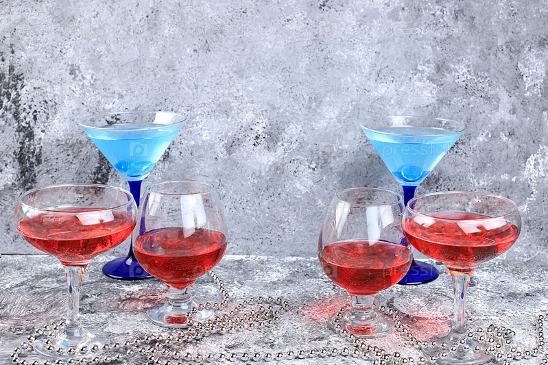 Ассортимент алкогольных коктейлей с лимонадом, вином, шампанским, грогом или мартини в стаканах на сером бетонном столе, концепция бара, праздничная вечеринка, избирательный фокус, место для текста