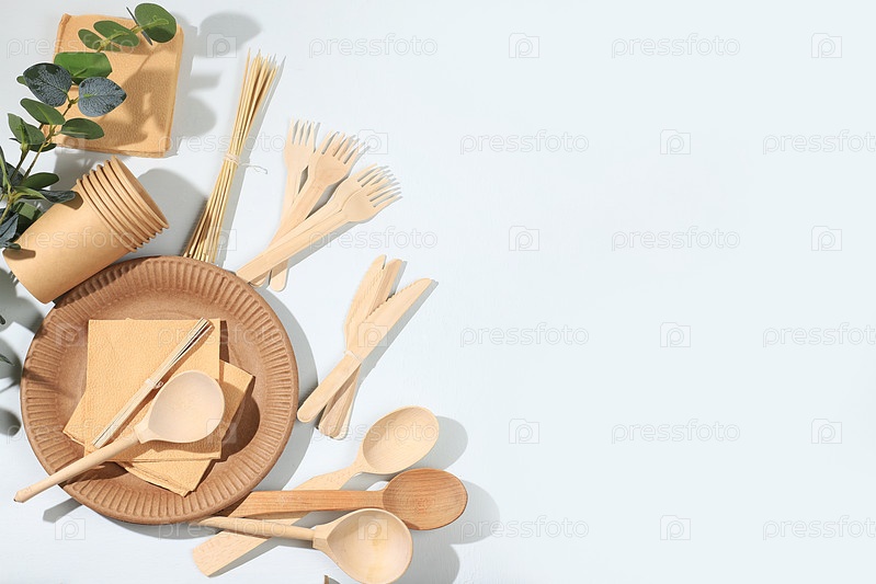 Набор экологически чистых блюд на солнечном столе. Бумажные стаканчики, тарелки, салфетки из крафт-бумаги, соломинки для барбекю, деревянные вилки, ложки и ножи, макет, концепция здорового образа жизни, ноль отходов. без пластика, выборочный фокус