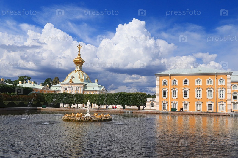 Россия, Санкт-Петербург, Петергоф, 8 июля 2019 г. На фото - главный придворный храм с двуглавым орлом на куполе в Верхнем парке Государственного музея-заповедника "Петергоф" и люди, которые гуляют в парке и полюбоваться архитектурой