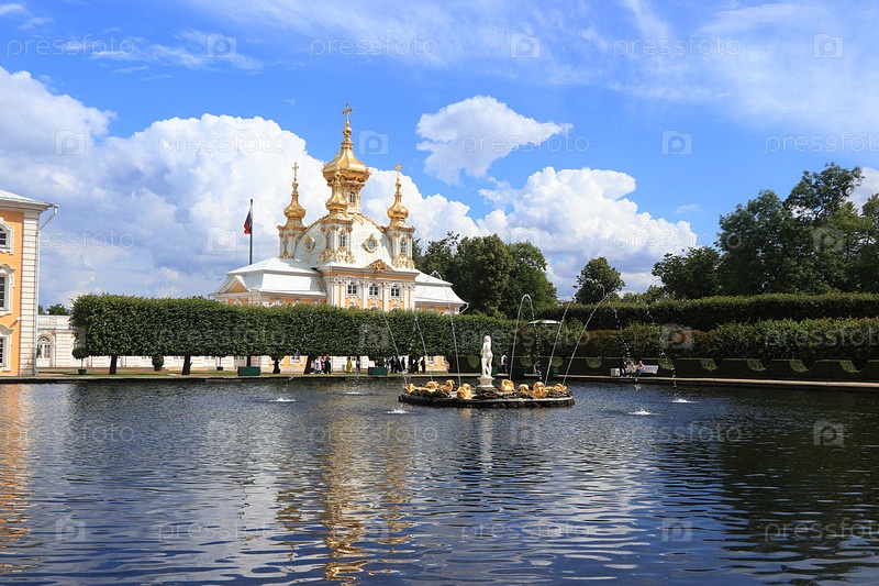 Россия, Санкт-Петербург, Петергоф, 8 июля 2019 г. На фото главный придворный храм в Верхнем парке Государственного музея-заповедника "Петергоф" и люди, которые гуляют в парке и любуются архитектурой