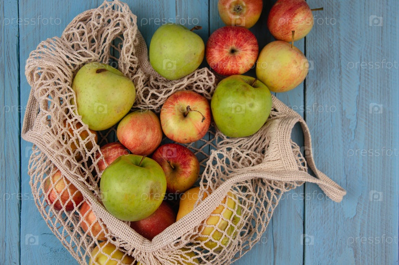 Вид сверху на органические яблоки в экологически чистой сетчатой сумке для покупок на синей деревенской доске. Без отходов, без пластика, экологически чистая, многоразовая концепция