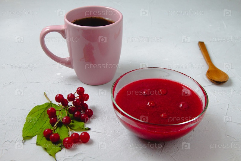Осенняя композиция с вареньем из калины, ветвями и листьями калины, белым льняным полотенцем, розовой чашкой и деревянной ложкой. Концепция завтрака