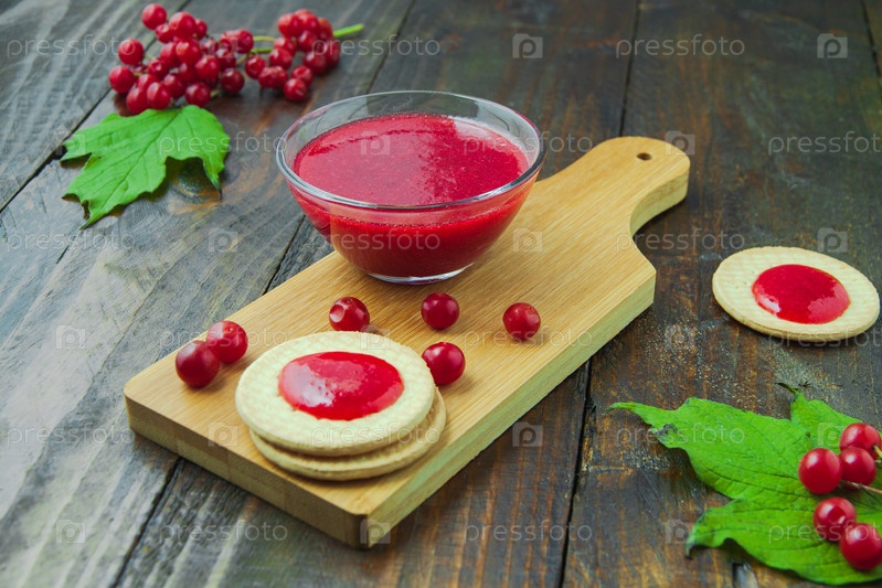 Варенье из калины с печеньем на деревянной доске, украшенной ветвями, листьями и ягодами. Осенняя композиция. Концепция завтрака