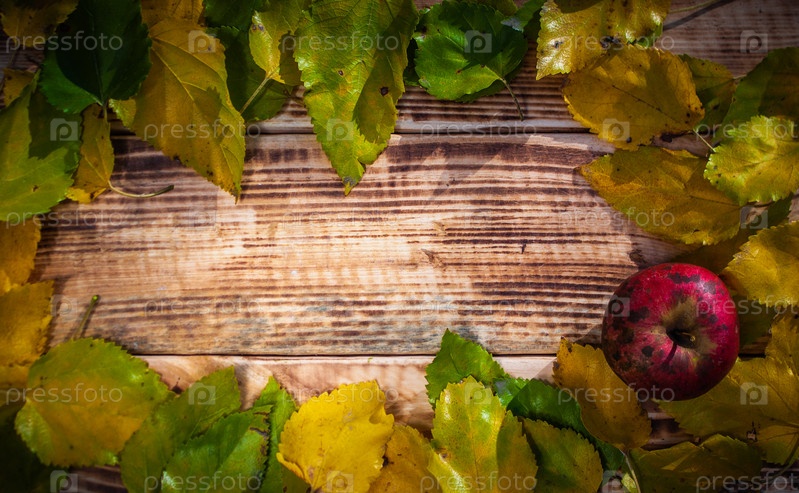 Вид сверху осенняя композиция с желтыми и зелеными листьями, лежащими на обожженном деревянном фоне с яблоком. Копировать пространство