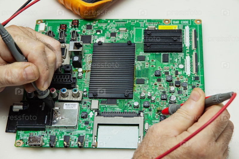 Мужские руки с тестером диагностируют материнскую плату телевизора