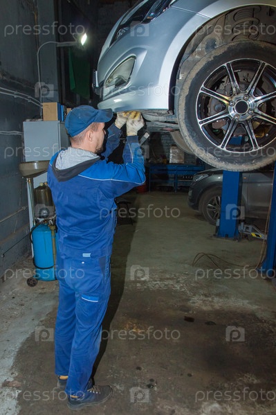 Механик осматривает автомобиль, висящий на гидравлическом подъемнике