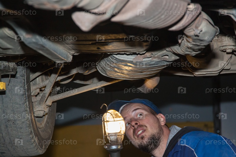 Механик с лампой осматривает днище автомобиля