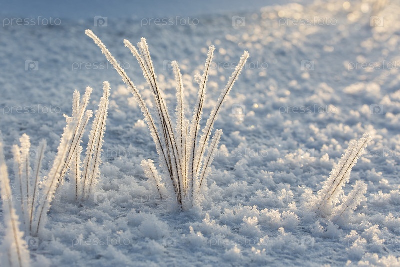 Трава, покрытая инеем крупным планом в контровом солнечном свете на снегу