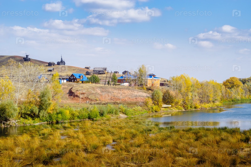 Саракташ, Россия - 1 октября 2020 г.: река Сакмара и кемпинг Красная гора на берегу