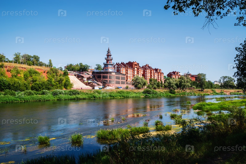 Оренбург, Россия - 18 июля 2020 г.: Вид на город с другого берега реки Урал летом
