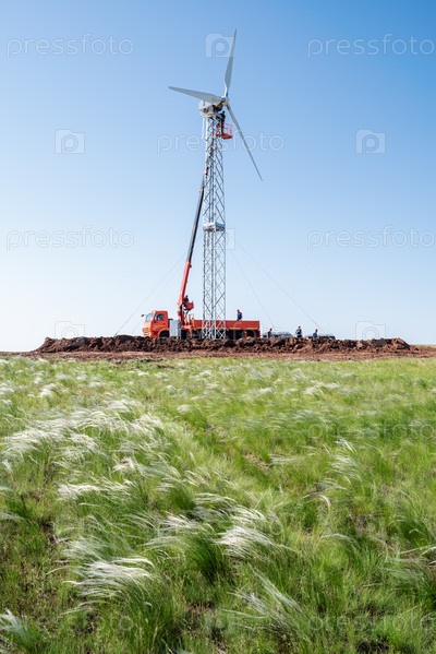 Строительство ветряной электростанции. Монтажные работы с использованием автовышки. Фото сделано солнечным летним днем в ковыльной степи, Россия