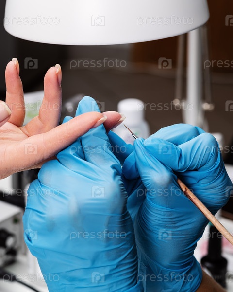 Маникюрный салон, нанесение бесцветного лака на ногти тонкой кистью, крупный план