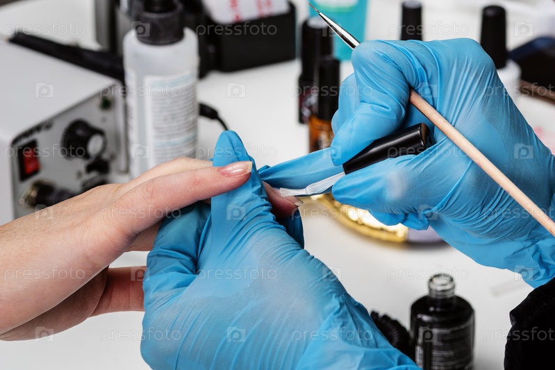 Маникюрный салон. Мастер в синих защитных перчатках наносит на ногти бесцветный лак. Крупный план