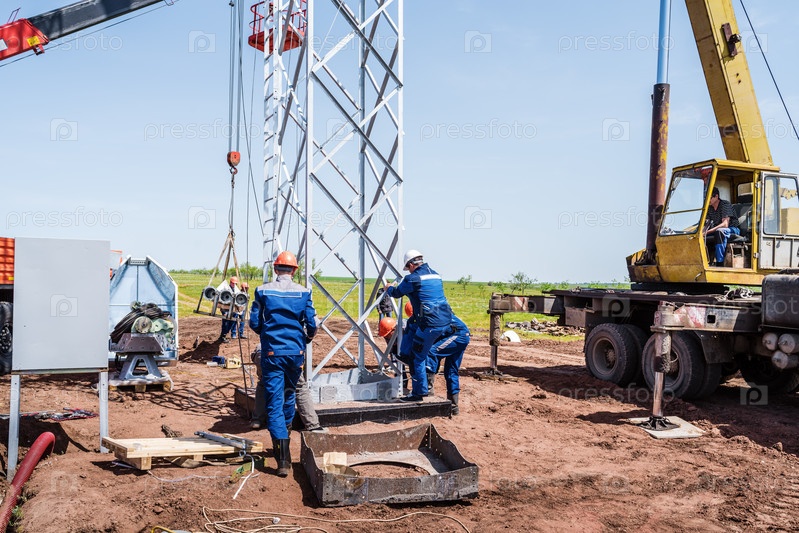 Рабочие на строительной площадке используют строительную технику для установки башни ветряной турбины. Россия, Оренбургская область