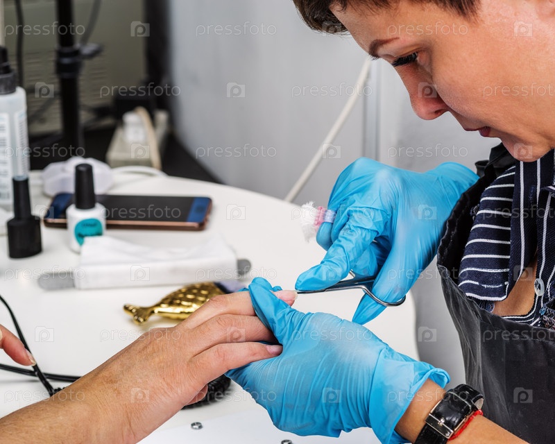 Маникюрный салон, руки мастера и клиента крупным планом, обработка ногтей маникюрными ножницами