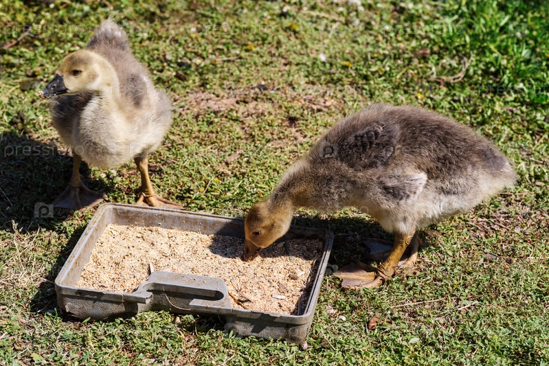 Два гусята на зеленой лужайке едят птичий корм из кормушки. Фотография сделана солнечным летним днем в сельской местности в России
