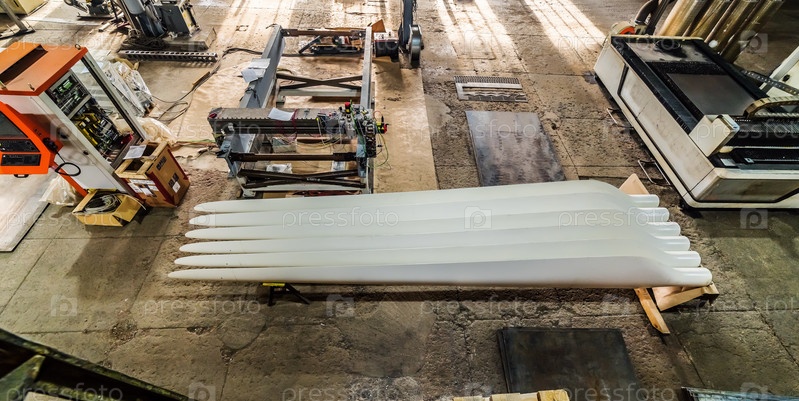 Два комплекта новых лопастей для ветрогенераторов в заводском цеху, вид сверху. Снимок сделан в России, в Оренбургской области, в производственном помещении промышленного предприятия