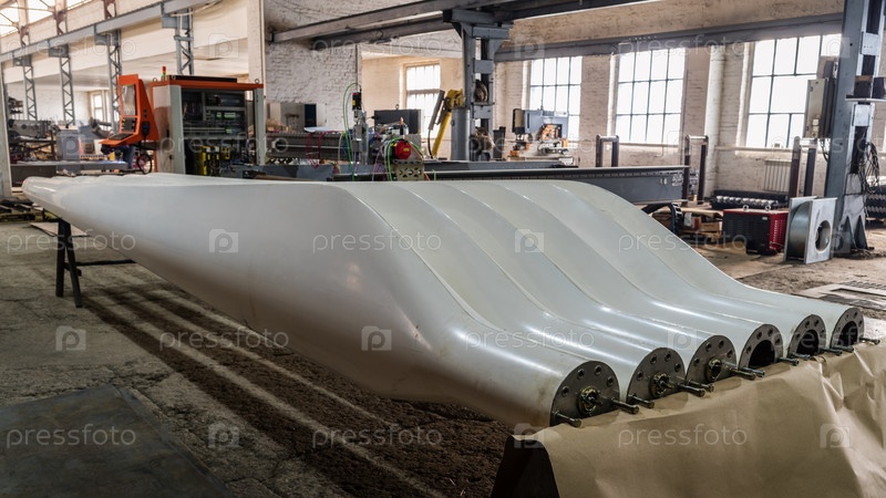 Два комплекта свежеизготовленных лопастей для ветряных турбин в заводском цеху. Снимок сделан в России, в Оренбургской области, в производственном помещении промышленного предприятия