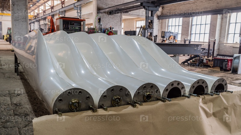 Два комплекта свежеизготовленных лопастей для ветряных турбин в заводском цеху. Снимок сделан в России, в Оренбургской области, в производственном помещении промышленного предприятия
