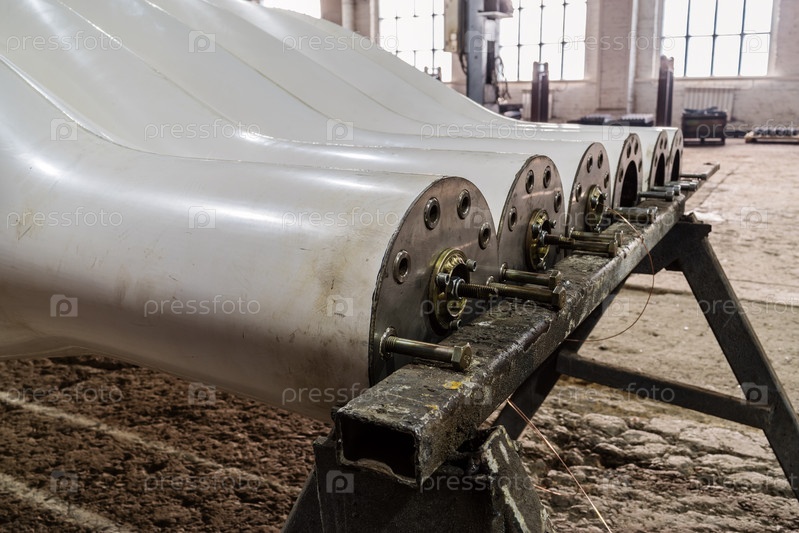 Два комплекта новых лопастей для ветрогенераторов в заводском цеху крупным планом. Снимок сделан в России, в Оренбургской области, в производственном помещении промышленного предприятия