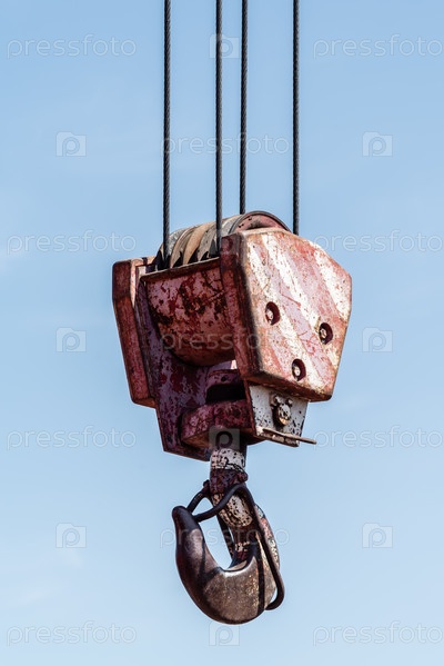 Крюк крана против голубого неба крупным планом. Россия, Оренбургская область