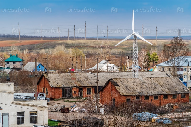 Ветрогенератор в промышленной зоне поселка. Снимок сделан в России, в Оренбургской области, в сельской местности