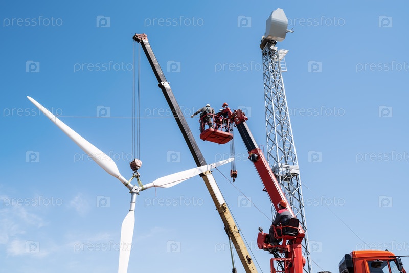 Строительство ветряной электростанции. Монтажники используют автокран и автовышку, чтобы поднять ротор ветряной турбины. Фотография сделана солнечным летним днем в России
