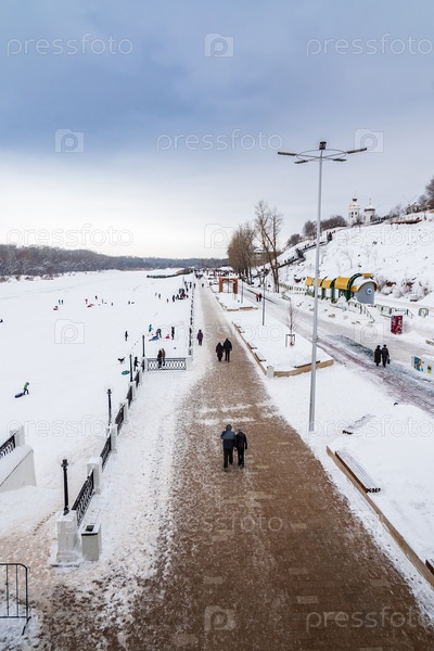 Оренбург, Россия - 19 января 2020 г.: Вид с моста на набережную реки Урал зимой