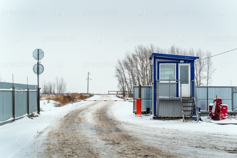 КПП со шлагбаумом для грузовиков на охраняемой территории зимой