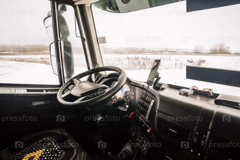 Место водителя в кабине грузовика, вид изнутри