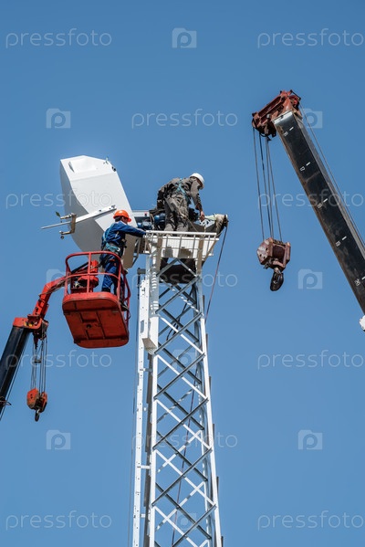 Рабочие на автовышке с помощью крана осуществляют монтаж ветрогенератора. Россия, Оренбургская область