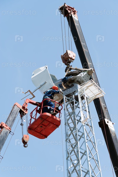 Рабочие на автовышке с помощью крана осуществляют монтаж ветрогенератора. Россия, Оренбургская область