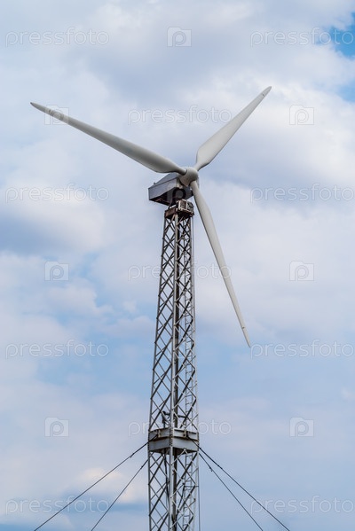 Ветряная турбина на металлической ферменной башне на фоне облачного неба. Снимок сделан в России, в Оренбургской области, в сельской местности