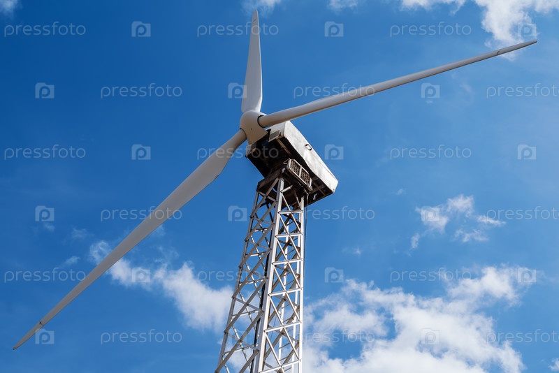 Ветряная турбина против голубого неба с облаками. Фото сделано в России, в городе Оренбург