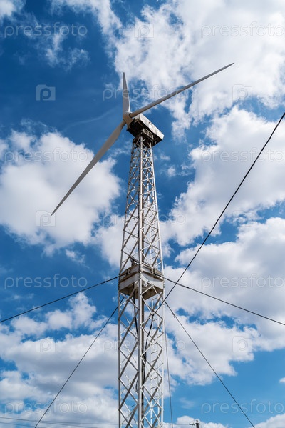 Ветрогенератор на фоне голубого неба с облаками. Фото сделано в России, в городе Оренбург