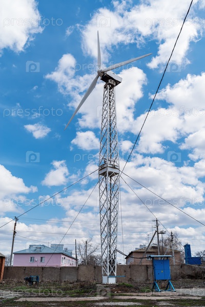 Ветрогенератор в деревне на фоне голубого неба с облаками. Фото сделано в России, в городе Оренбург