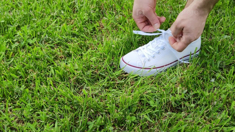 Мужчина завязывает шнурки в чистых белых кроссовках, стоя на молодой зеленой траве. Красивые новые белые туфли. Ноги мужчины обуты в кроссовки, руки связывают шнуры. Крупный план. Человек пробует свои шнурки на чистых белых sneakers standing on the young
