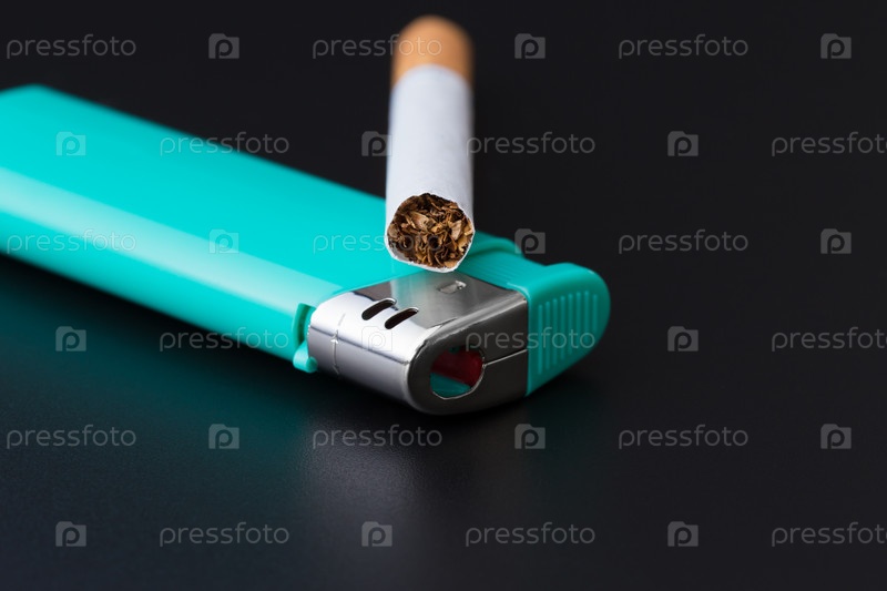 Сигарета лежит на зеленой зажигалке на темном фоне крупным планом