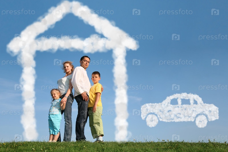 Семья из четырех человек мечтает о доме и машине, коллаж