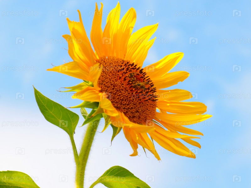 Пчела опыляет красивый спелый яркий цветок подсолнуха